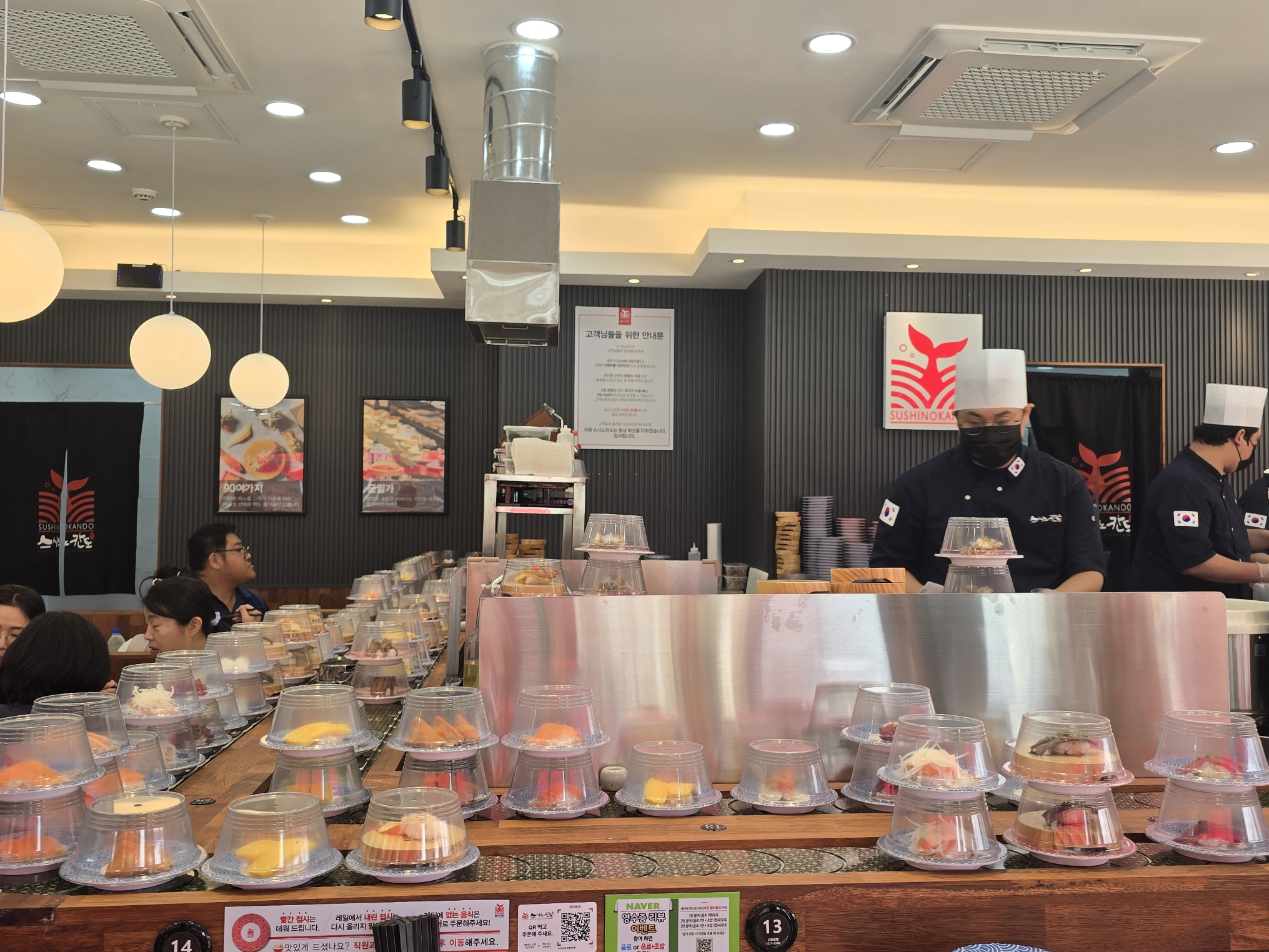 스시노칸도는 회전 초밥 시스템으로 운영됩니다.